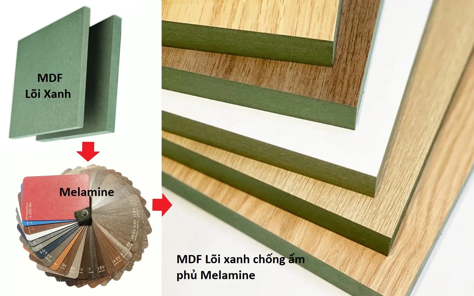 Gỗ MDF lõi xanh chống ẩm phủ Melamine.