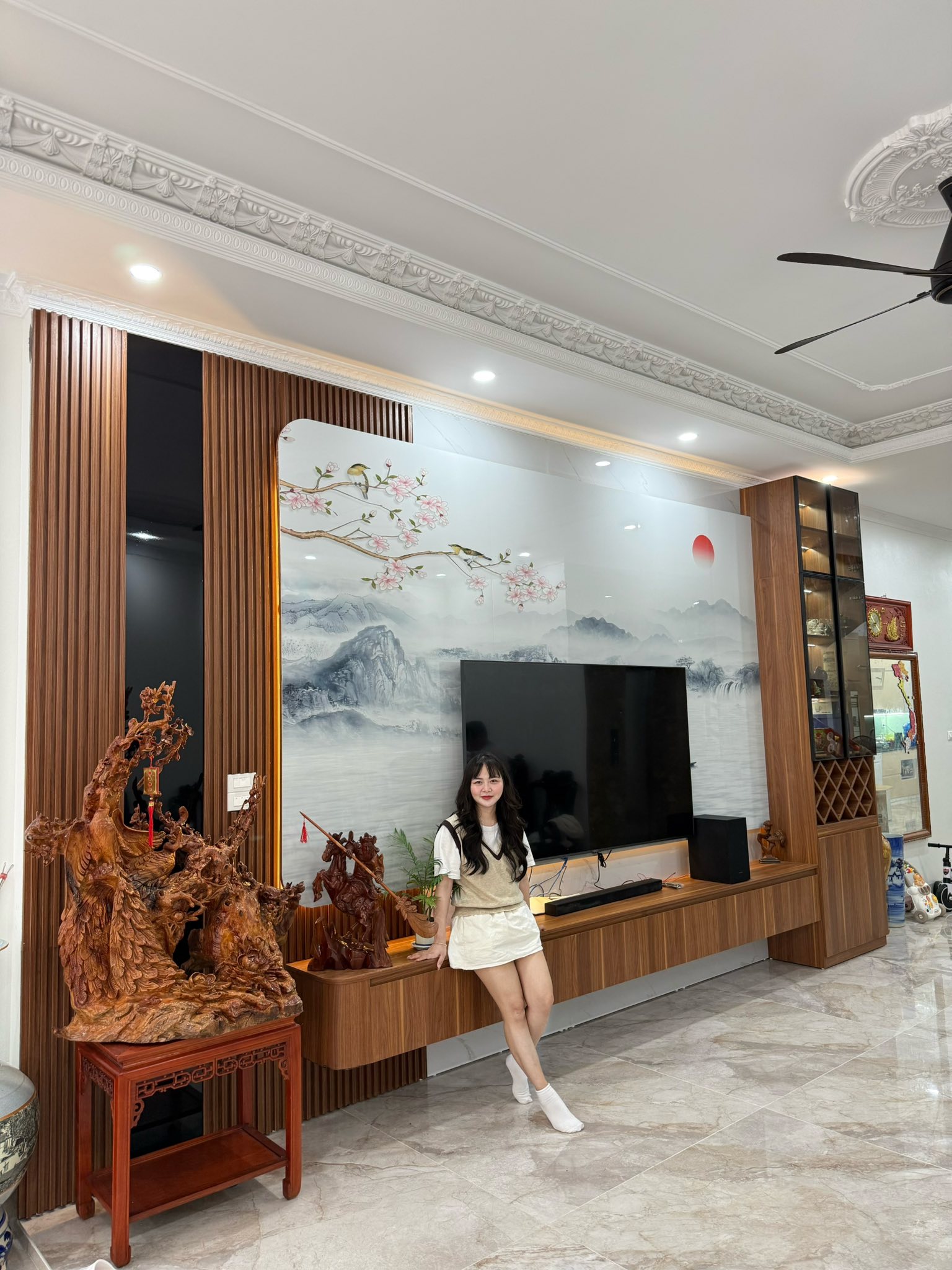 Thi công nội thất phòng khách gỗ MDF lõi xanh chống ẩm bền đẹp tại Ninh Bình.