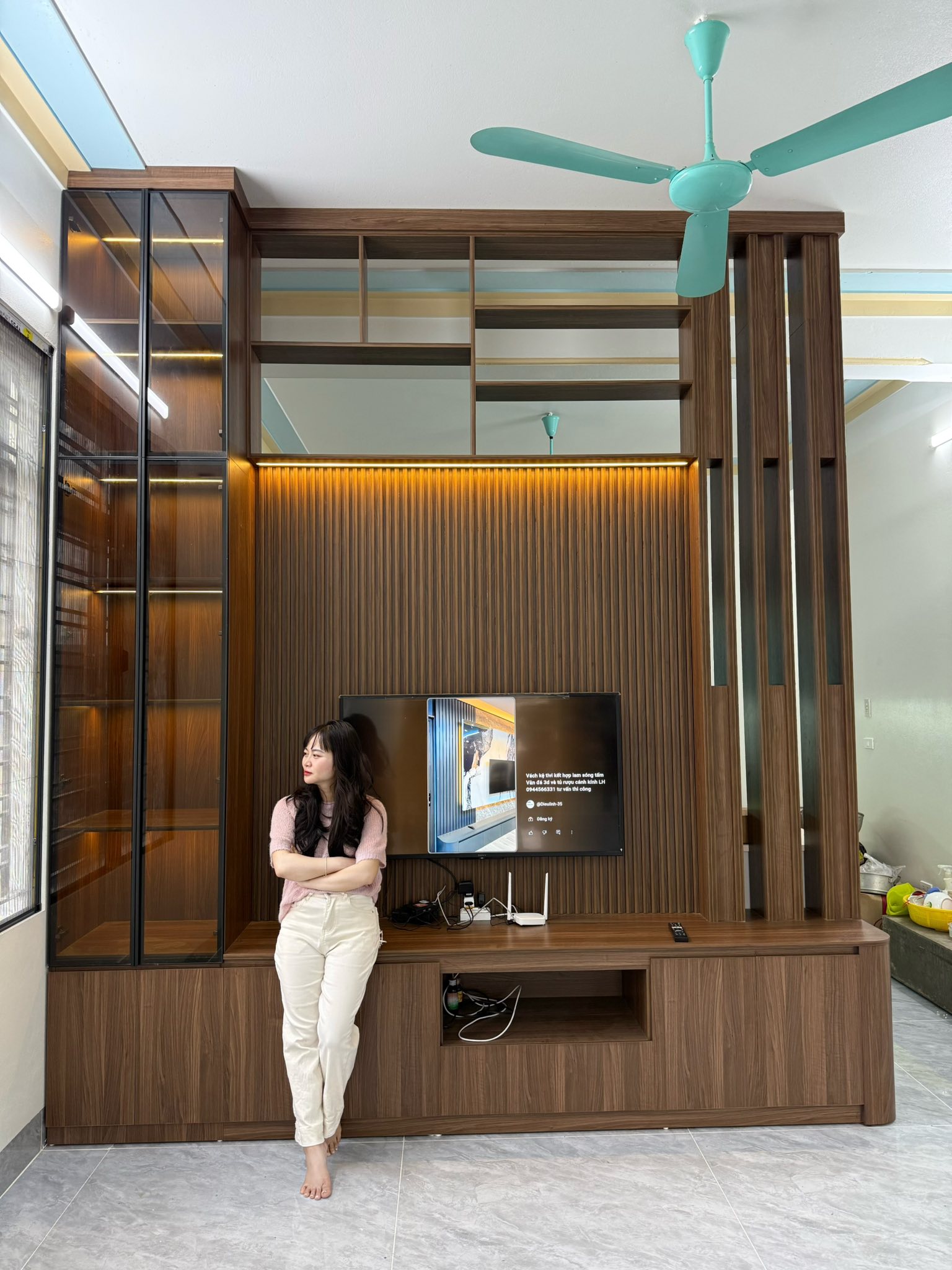 – Vách lưng kệ tivi ốp nhựa PVC giả vân đá sang trọng, tinh tế.